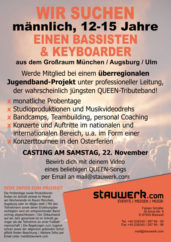 Bewirb dich bis zum 9. November mit einem Video eines QUEEN-Songs deiner Wahl an deinem Instrument per Email an mail@stauwerk.com – das Casting findet am 22. November in 86415 Mering statt!